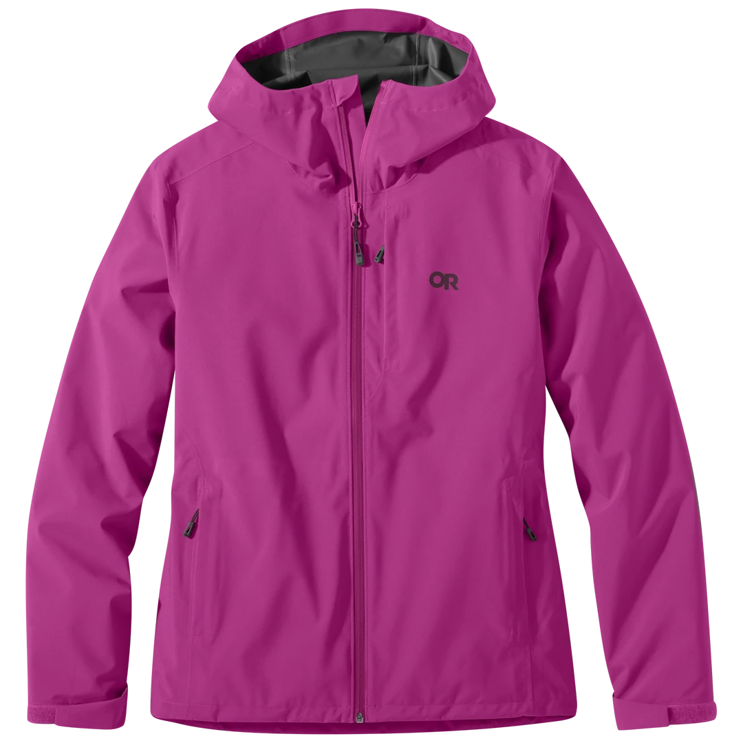 The unique soft hand feel of the fabric of this new women’s Dryline rain jacket from Outdoor Research make it stand out in the crowd from the typical stiff, crinkly, boardy nature of most rain shell jackets.Ā This waterproof/breathable rain jacket presents an incredible value while still being feature-packed with movementĀ mirroring 2.5-layer stretch fabric, pit zip venting, a fully adjustable hood, and 2 zippered handwarmer pockets and a zippered chest pocket.